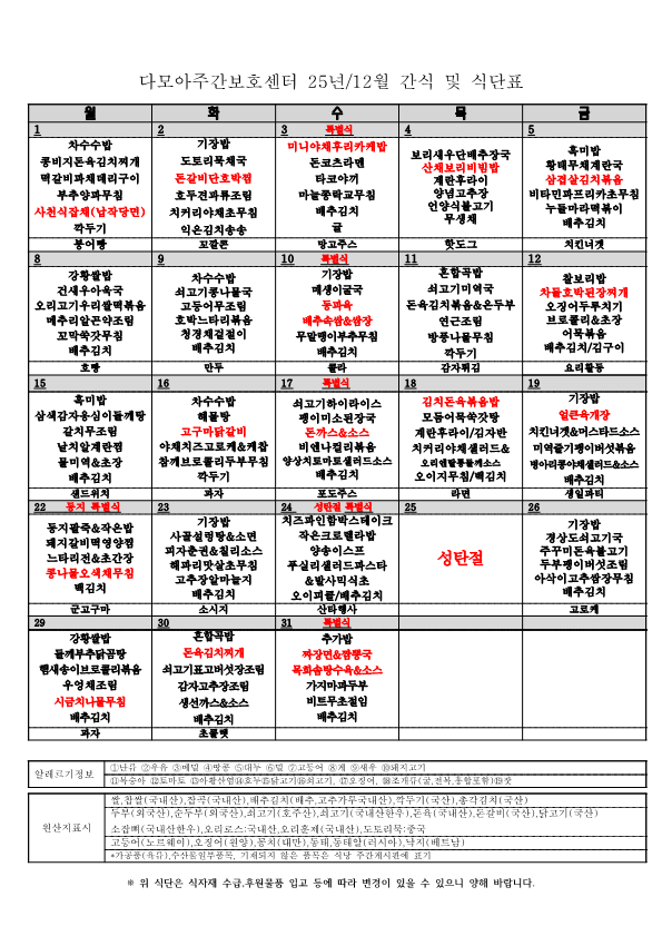 2025년 12월 식단표 및 간식표입니다. 페이지 정보 작성일 : 25-12-02 19:50 조회 : 121회 관련링크 본문 2025년 12월 식단표 및 간식표입니다. 이전글 다음글 목록