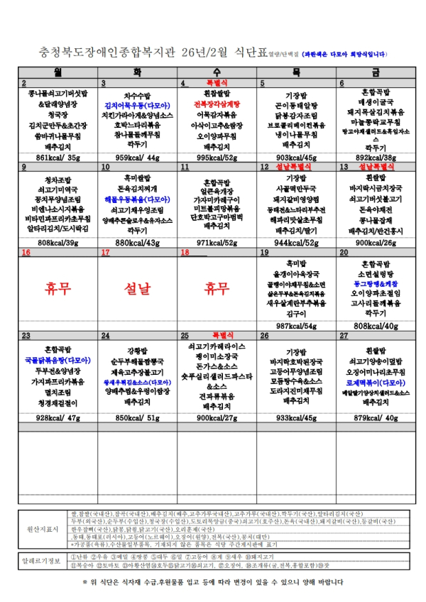 2026년 2월 식단표입니다.